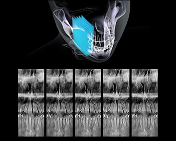 - Un examen focalisé à une zone d’intérêt et qui crée de fines coupes à intervalles réguliers le long de la mâchoire