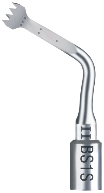 BS2L : Scie à os latérale à quatre dents, pour la découpe d’os cortical ramique. Orienté à gauche ou à droite, cet insert effectue des traits d’ostéotomie verticaux et horizontaux sur la mandibule droite ou gauche du patient.