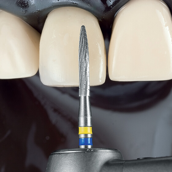 La H48LQ est une fraise en carbure de tungstène (multi-lames) de mise en forme et de pré-polissage des restaurations composites (conseillé pour les faces vestibulaires)