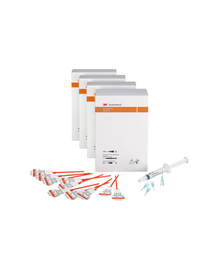 100 ou 200 unidoses L-Pop, 1 seringue de 3ml de Scotchbond Universal Etchant + 25 embouts jetables, des guides techniques, un mode d'emploi