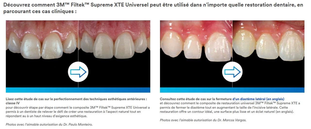 Conçu pour chaque restauration – antérieure ou postérieure – le matériau polyvalent Filtek Supreme XTE Universel offre une excellente rétention du poli, une manipulation exceptionnelle et une résistance remarquable. Ce matériau de restauration universel, radio-opaque et opalescent bénéficie d'une fluorescence naturelle, ce qui vous permet d'offrir à vos patients des obturations dentaires aux résultats esthétiques inégalés. Il est disponible en 36 teintes et 4 opacités (dentine, corps, émail et translucide).